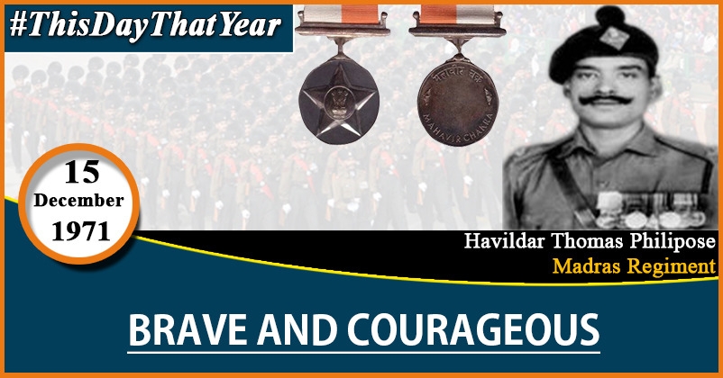 Thomas Philipose (born 8 July 1942) was a havildar (sergeant) in the Madras Regiment during the Indo-Pakistani War of 1971. During the 1971 war, the Madras Regiment was tasked to capture Lalial and Sarajchak, prior to establishing a bridgehead across the river Basantar. Enemy minefields covered the entire area and the Pakistani infantry was well entrenched in the area. Pakistani observation posts kept a close watch over Indian movement. Undaunted, the Madras Regiment attacked Lalial on 16 December. When the platoon commander and several others were wounded, havildar Philipose took charge. Accompanied by only 15 men, the havildar led a fierce attack and secured Lalial. The enemy soon regrouped for a second attack. Philipose and his men, however rushed at the advancing enemy with fixed bayonets, Philipose was hit by a bullet but he kept going. The ferocity of the charge unnerved the Pakistanis and they began retreating. A stray bullet hit Philipose again, but he held on grimly till the battle was won. He was honored by being awarded with the Mahavir Chakra for his steadfastness and courage.