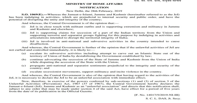 The Government of India banned Jamaat-e-Islami Jammu and Kashmir (JIJK), a separatist organization, for five years because it seeks religious routes to subvert democratic and secular fabric of Jammu and Kashmir (J&K) and India. JIJK is consistently making efforts to separate J&K from India and merge it with Pakistan. Hence, the ban was imposed on it because of its anti-national and subversive activities. The ban was imposed amid growing tension between India and Pakistan, after Pulwama attack, in which more than 40 CRPF soldiers were martyred. The Government of India found that JIJK “has been indulging in activities which are prejudicial to internal security and public order, and have the potential of disrupting the unity and integrity of the country.” This separatist organization was banned under Section 3 of the Unlawful Activities (Prevention) Act, 1967. The organization is involved in anti-national and subversive activities in the country and is in close connection with terrorists that would have further escalated the problem of terrorism in India if the Government would not have swung into action. As per the order passed by the Ministry of Home Affairs, “central government is of the opinion that JIJK is in touch with terrorist outfits, and is supporting extremism and terrorism in Jammu and Kashmir, and elsewhere. With the banning of Jammat-e-Islami, the number of organisations banned under UAPA now stands at 42.